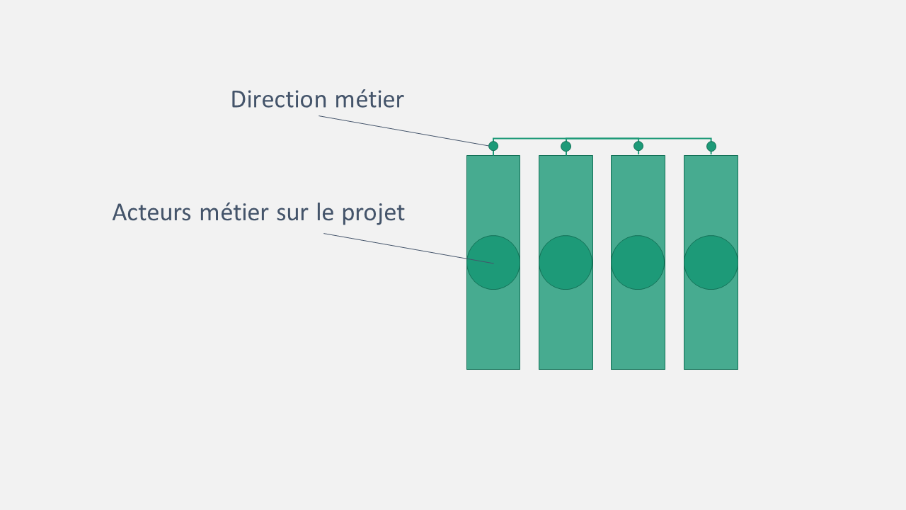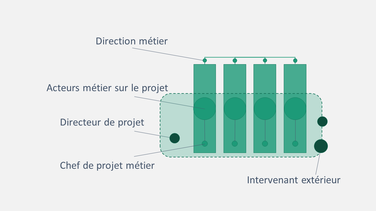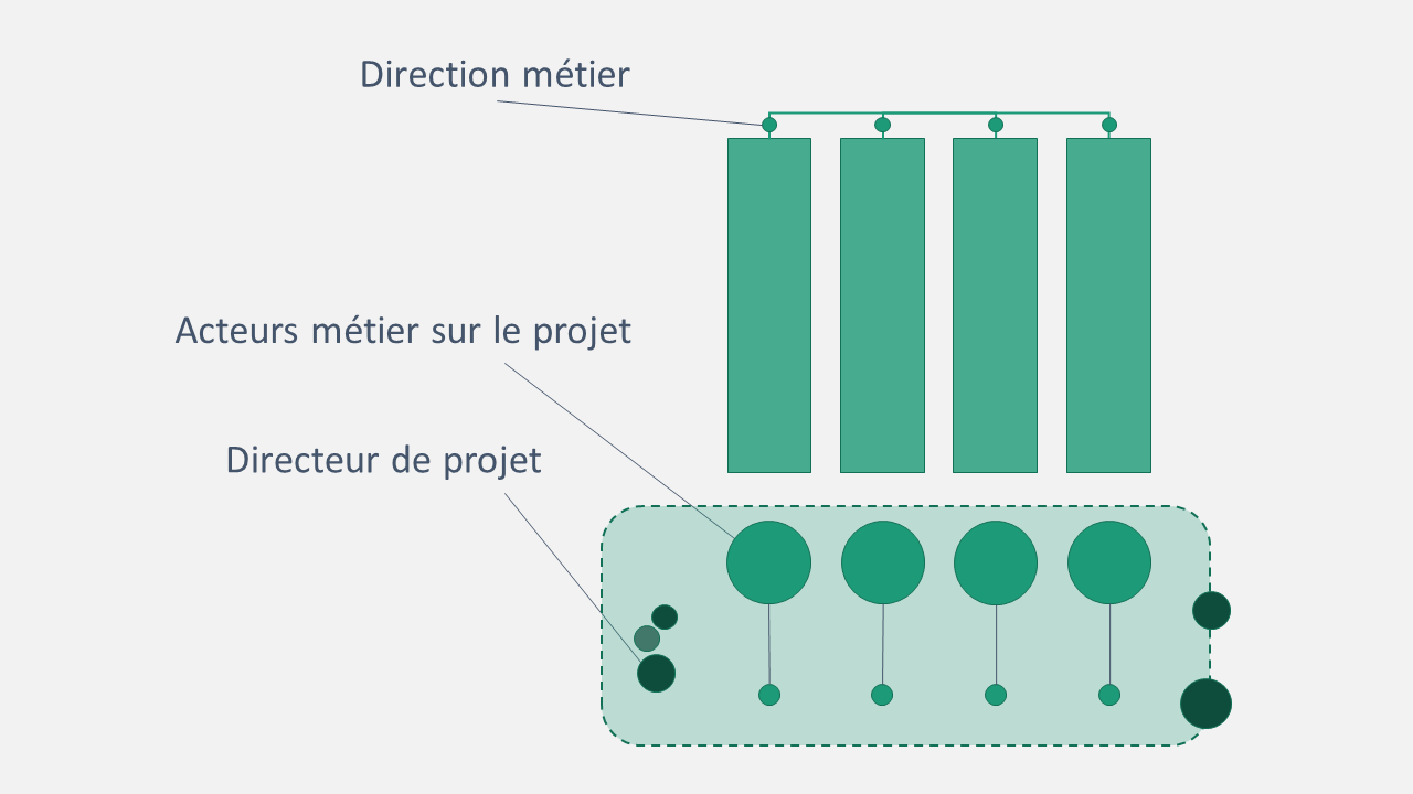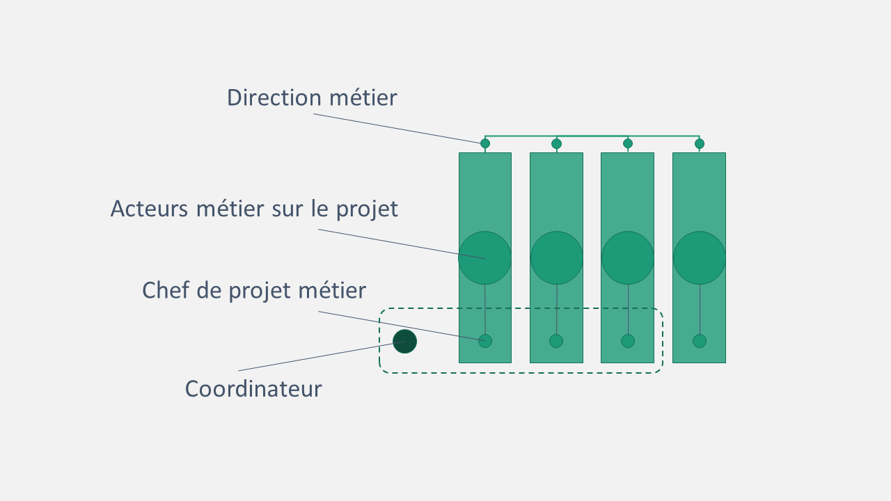 La direction de projet repose sur une structure matricielle. On donne beaucoup plus de poids au coordinateur, mais les rattachements métier subsistent.