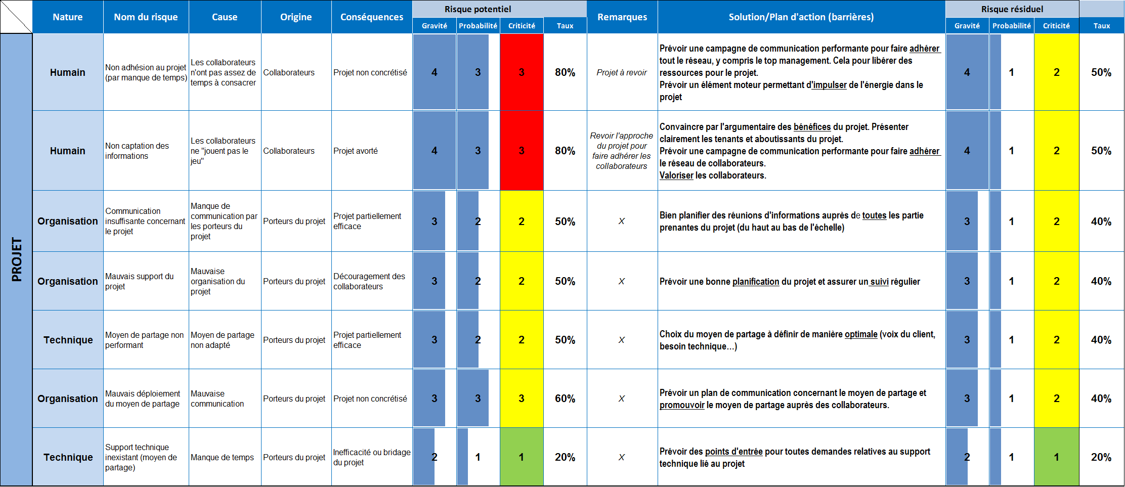 Les risques peuvent être organisationnels, humains, financiers… et/ou survenir lors des phases du projet. En pratique, l’analyse va permettre de déterminer/évaluer la criticité d’un risque par le croisement de sa probabilité et de sa gravité,