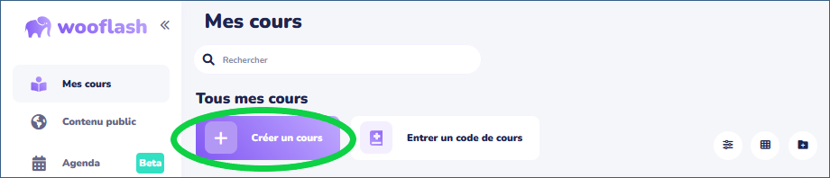 - Une fois connecté, vous accédez à votre interface Wooflash. Pour créer un "cours" (questionnaire) Wooflash, cliquez sur "Créer un cours".