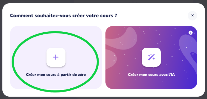 - Si vous souhaitez rédiger vous-même vos questions, cliquez sur "Créer mon cours à partir de zéro". En cas contraire, consultez le guide Créer des QCM avec l'IA de Wooflash.