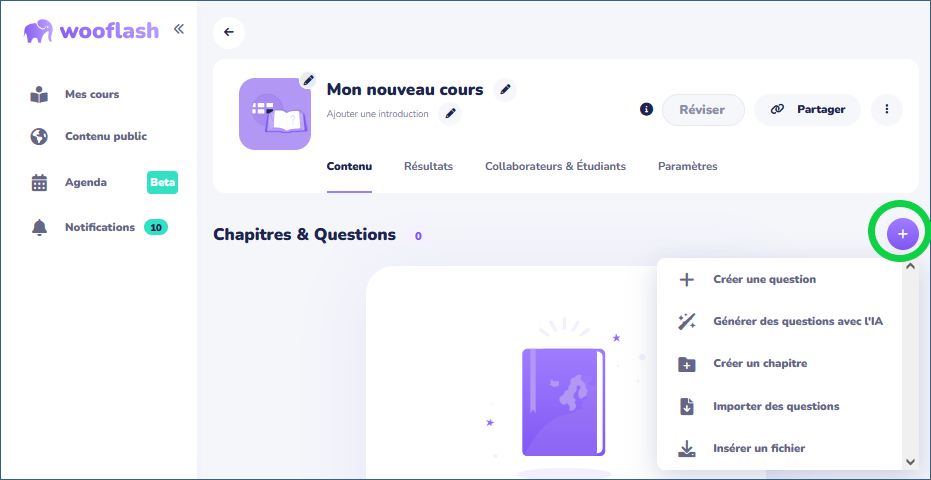 - Pour créer vos questions, cliquez sur le bouton "+" à droite : vous pourrez alors choisir de, soit créer une question, soit en importer, soit créer des chapitres pour les organiser.