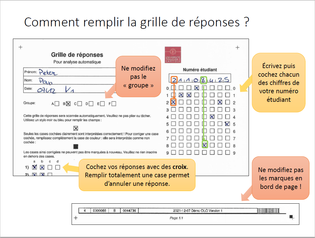 Attention, pas de correcteur blanc autorisé ! Pour corriger une case cochée, remplissez complètement la case de couleur : elle sera interprétée comme non cochée.