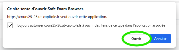 - Si une fenêtre pop-up demande alors votre autorisation pour ouvrir Safe Exam Browser, cochez la case et cliquez sur "Ouvrir".