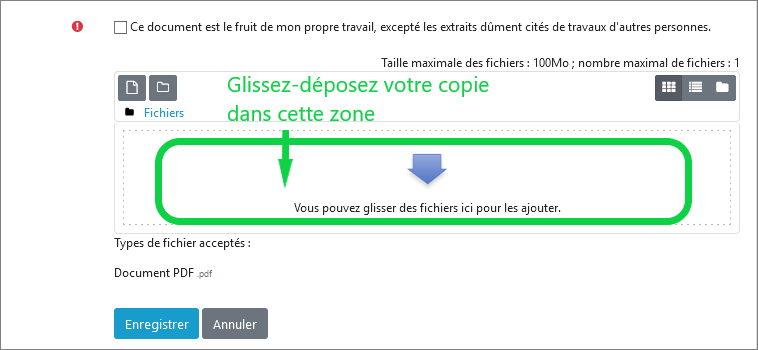 3. Si vous rencontrez un problème pour le dépôt de votre copie via le sélecteur de fichier, utilisez le glisser/déposer afin de la déposer (voir zone de Glisser-déposer ci-dessous) :