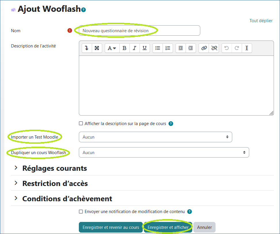- Le champ"Importer un quiz Moodle" est est réglée sur "Aucun" par défaut : il vous permet, le cas échéant, d'importer un test présent dans le même espace de cours et de le convertir en activité Wooflash.