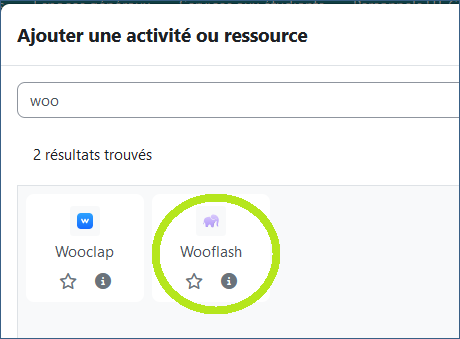 Pour cela, il vous suffit, en mode édition, dans l'espace de cours concerné d'ajouter une activité "Wooflash" :