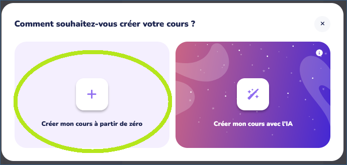 - Si vous souhaitez rédiger vous-même vos questions, cliquez sur "Créer mon cours à partir de zéro". En cas contraire, consultez le guide Créer des QCM avec l'IA de Wooflash.
