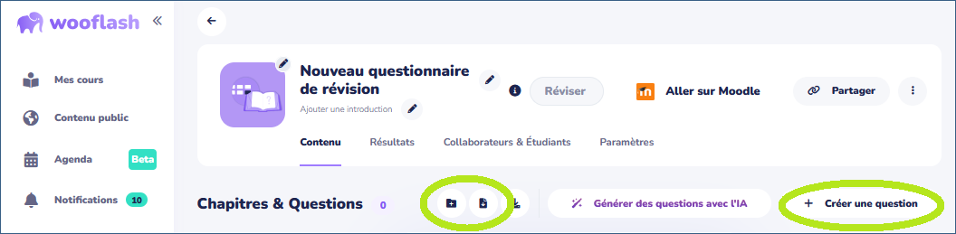 Les deux boutons du centre vous permettent également, soit de créer des chapitres pour les organiser, soit d'importer, des questions.