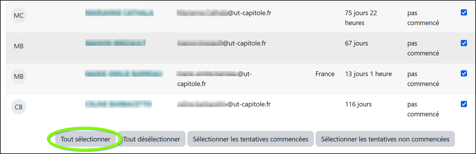 Cliquez ensuite sur le bouton "Tout sélectionner" afin de désigner comme destinataires l'ensemble des utilisateurs n'ayant pas répondu au questionnaire :