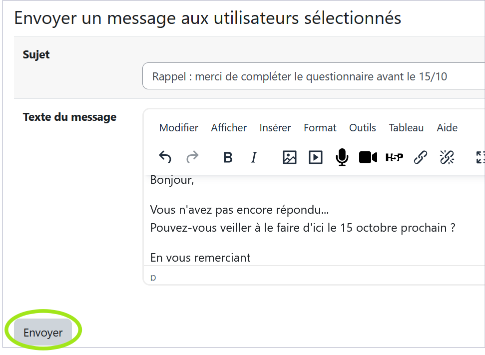 Saisissez le sujet et le texte du message de relance, puis cliquez sur "Envoyer". Le message sera envoyé à l'ensemble des destinataires sélectionnés à l'étape précédente.