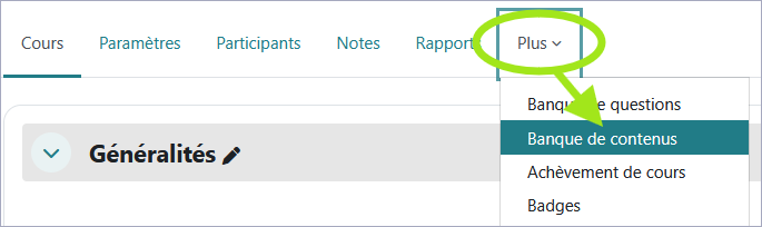 • Dans votre espace de cours en ligne, déroulez le menu "Plus" et choisissez "Banque de contenus".