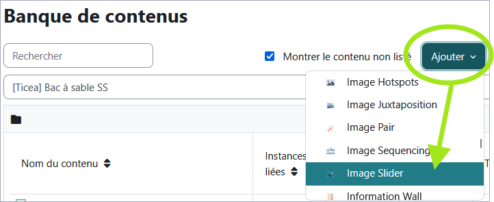 • Cliquez sur "Ajouter" et choisissez le type de contenu (par exemple, Image slider) :