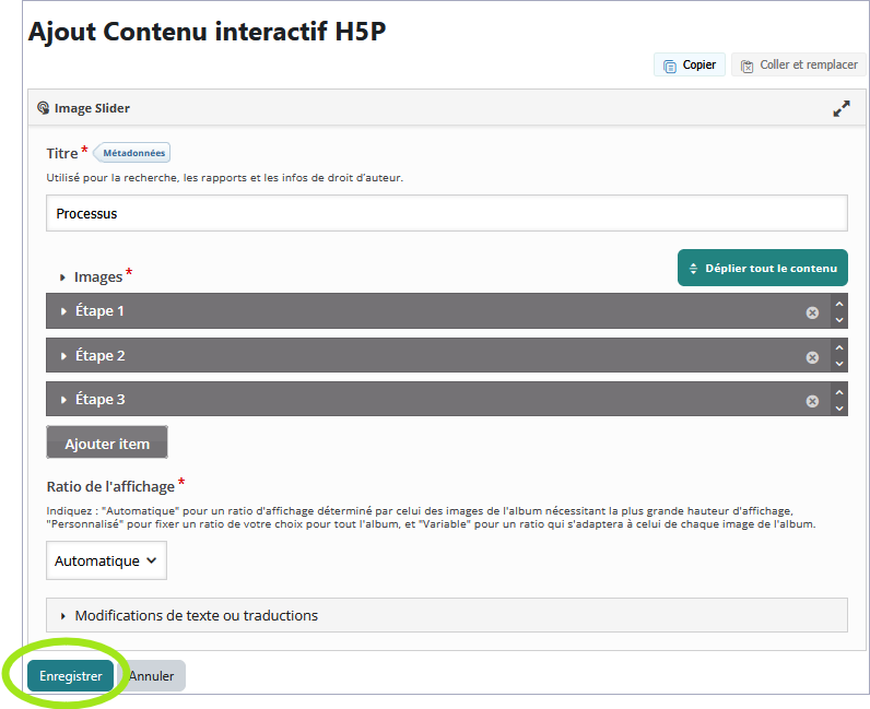 • S'ouvre alors la fenêtre de création du contenu H5P choisi.