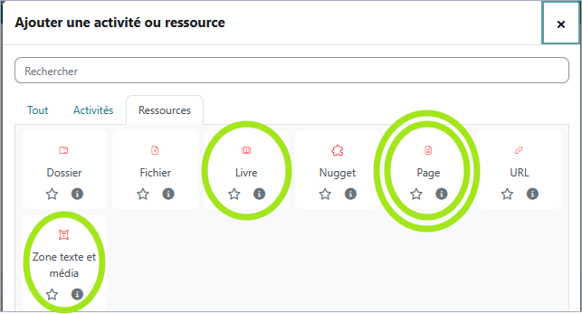 • Sélectionnez une ressource "page" dans le sélecteur d'activités ("livre" ou "zone texte et média" sont possibles également) :