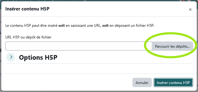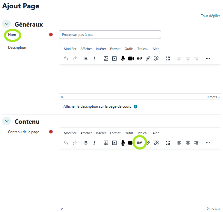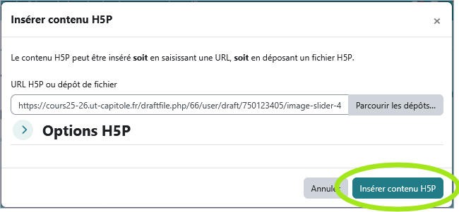 • Saisissez le nom de la ressource, puis dans l'éditeur de la zone de contenu, cliquez sur le bouton "H5P".