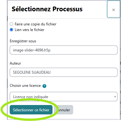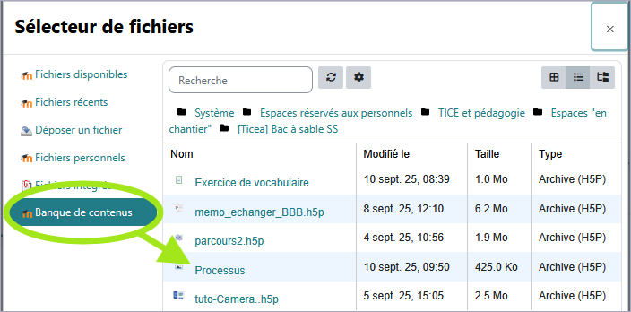 • Fermez la fenêtre pour revenir sur la page de création de l'activité (qui se situe dans l'onglet précédent du navigateur), puis appelez le contenu dans la banque de contenus comme illustré ci-dessous :