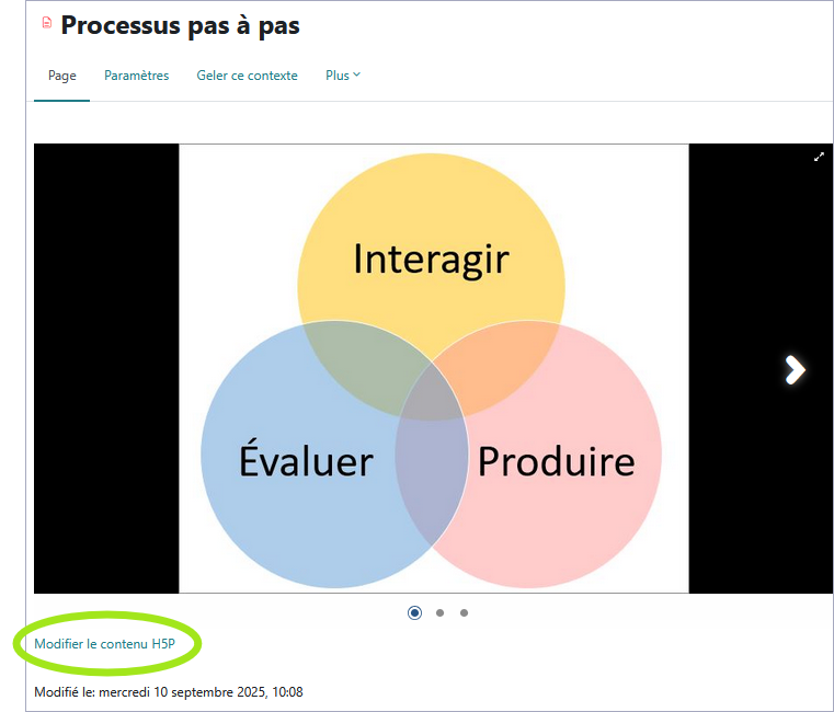 Ouvrez la ressource (page), puis sous le contenu cliquez sur le lien "Modifier le contenu H5P" :